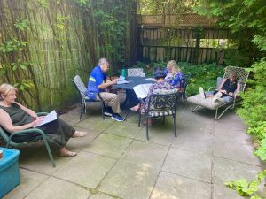 The workshop launched at 10 a.m. yesterday. There were supposed to be 12, including a 17-year-old boy, but he was ill and another couldn’t make it, so there were ten. Three of them brought their published books to show and to sell. And as always, it was a joy to hear minds at work and pens scratching (devices are forbidden) at first on the deck, and then spread throughout the garden. The weather was perfect, mild and a bit cloudy. And much good work was done. We finish always with a glass of wine and discussion; one of the participants suggested they establish a Zoom link and continue to get together, to support each other’s work. Nothing could make me happier.