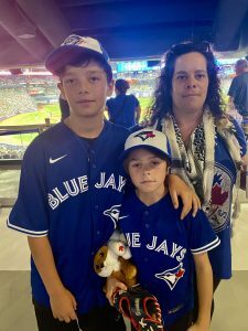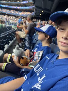 Even on the subway to Union Station on the way to the Blue Jays game last night, I was enveloped in team fervour, lots of excited people in the jerseys and caps. As were my grandboys, fully decked out in blue merch, with a mitt in case an errant ball came our way. Anna wore her Jays jersey beneath her keffiyeh, as is her wont. Grandpa Ed and I had bought good seats at vast expense for Ben’s birthday, as both boys love baseball. Ben was especially excited as he thought that somehow we were going to get him to the bullpen to get his cap signed by the players; he was disappointed to learn this was not possible.