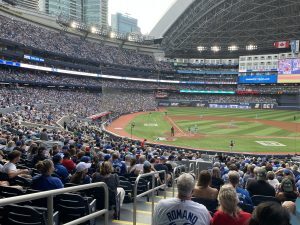 It was dull. Long patches where little happens — umpires consulting, pitchers stretching and spitting, the Jumbotron exhorting us to “Make Some Noise,” so 36,000 people did. There were some thrilling catches, and two Jays home runs leading to roars of joy, but the other team was more solid. By the 8th inning, Ben was writhing, and we left. I was surprised thousands were also streaming out before the end. Final score: Rays 4, Jays 2.