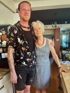 Another thing Mosley suggests is a gratitude journal. I am always grateful, as perhaps you know, but have started to keep one anyway, writing down last thing at night 3 or 4 things loved during the day. Today, so far, it will be running into Annie at the market this morning, the walnut raisin bread from St. John’s Bakery, and eating the stir fry my son cooked for me yesterday. My son the Viking, who just sent this from his gardening job, saying, “Greetings from sweaty work day! Love you.”