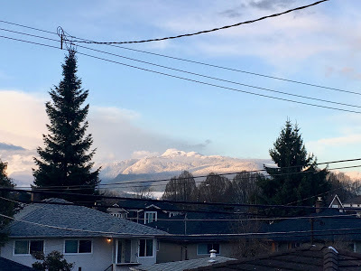 Can you see them? Above the trees - not cloud, but snow-topped mountains stretching across the horizon. Just after we got home, it started not to rain, but to hail, pellets bouncing off the windows.We watched much of the Juno awards, taking place not far away in Vancouver this year, and a terrific production it was too. How Canadian, the moving tribute to Gord Downie, the self-deprecating humour of Michael Buble, the reunion of the terrific Barenaked Ladies. And all those young singers in weird clothes - one in a white one-piece like long underwear, another with long fuschia hair - making us feel old and staid. Which is of course the point.