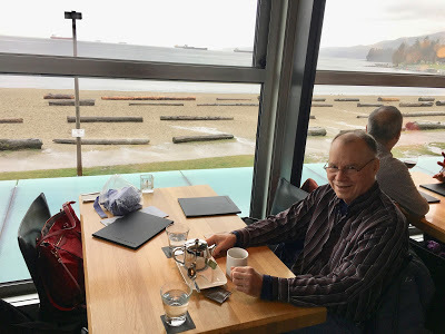 Monday, Margie drove me to Bruce's tiny apartment in the West End, right on the water, where I used to stay while he was in Italy. Just after our time together in Nice last year, my dear friend had a stroke, luckily while he was staying with an Italian friend near Ravenna. His friend got him to hospital quickly, where he stayed for weeks; his sister and brother-in-law came to look after him, and eventually another brother and a Vancouver doctor came to bring him home. He was in hospital here for weeks, then in a rehab hospital, and is now home and looking terrific. You wouldn't know anything had happened to him, though he has little movement on the right side of his face, still has blurry vision in that eye, and can't feel his mouth at all. But he is trim and cheerful, and - miracles for a thrifty man - has bought a new chair and a sofa bed, upon which I am ensconced. He made me go out three times in the downpour, for lunch, to shop, and again for dinner. Because he is from Vancouver, and thus covered with scales. They should have shot The Shape of Water here rather than in Toronto; here, everyone is a fish.