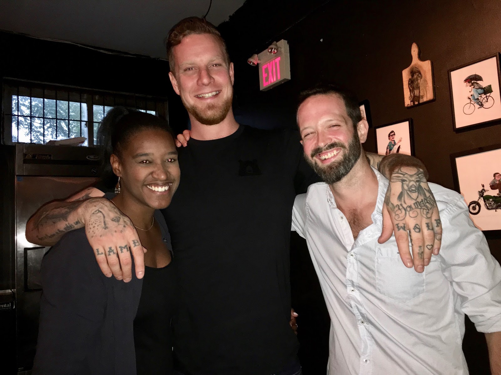 We sat at long tables, moving around to talk to different people, and the food kept coming - oysters, salads, dips and bread, pasta, small burgers, steak, all gourmet and delectable - and then a decorated chocolate cake made by Eli with a little help from his mama. Sam was his usual open and funny self, moving around to keep company with everyone, including his 5-year old nephew and his high school friend Dustin's 3-year old daughter, imperious and beautiful in her cornrows.