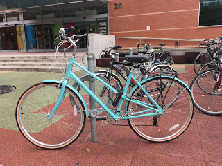 Yesterday, I spent much of the day riding my new bike, Marilyn, around town in the soft sun. I'm crazy about her - so comfortable, her handlebars so high, I feel like a little kid with his first BMX. Here she is at the Y today. Sea foam blue, Norco named her colour. Not sure I've ever seen sea foam that colour, but who cares?