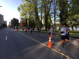 It was the Vancouver Marathon this morning, which goes right by Bruce's front door - both the half and the full marathon, fronted by the Africans, the human cheetahs who pound by as if just running for the bus instead of finishing many kilometres. And then, behind, the great normal runners, and then the ordinary folk, thousands of them lumbering along. I went down to applaud, and for the rest of the day, the city was full of people wearing marathon medals around their necks. Well deserved medals.