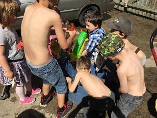 So, yesterday was Eli's fifth birthday party, and yes, the expected multitudes did appear: 18 adults and 19 children, almost all boys, under the age of 10. Luckily the sun was out and they rampaged in the backyard, though a few went inside and wreaked havoc with the toys in Eli's room. All the boys needed was some water guns, a lot of water, and some dirt to make mud. Happiness is. Little Ben kept getting so wet, he needed to be changed three times. After hours of mud, it was time for hot dogs and chicken drumsticks. And then Glamma slipped away, before the orgy of cake and presents. A good time, it's safe to say, was had by all.