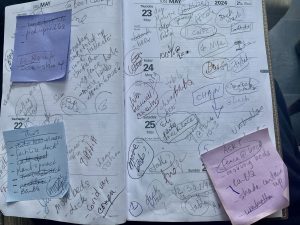 In case you don’t believe me about how busy I’ve been this last while, here’s this week’s day-timer. Incidentally, the recurring note to buy cheap beer is as slug killer. In case you wondered. Not for my sluggish self. Still haven’t made it to the LCBO.