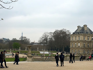 Luxembourg Garden and its palace with Eiffel Tower peeking through. The sun had vanished and it was cold and damp.