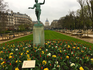 Statues, vistas, and flowers everywhere. This is in Luxembourg Garden; he's a Greek actor learning his lines. I cut off his head to get more flowers. And below - always have to go see her first day, so I'm sure that I'm actually here. Yes, I guess I am, because there she is. Be still, my beating heart.