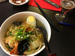 My dinner tonight - at 6.30, the only person in the restaurant, of course, as my eyes were drooping shut - a fantastic ramen place nearby. Perfect for the exhausted stranger on a cold night. With a beer! Wine starts tomorrow.And now - it's 7.10. I've made it. A quick shower, a sleeping pill and I hope tomorrow I'll be my usual perky self.