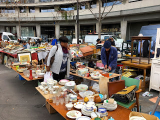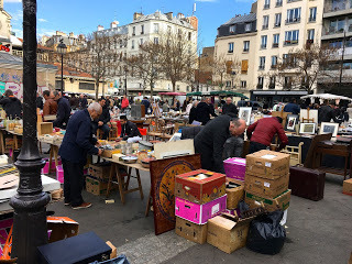 As many of you know, I am an inveterate shopper in junk stores. Never did I think I'd live in the middle of one in Paris - one of the best-known marchés aux puces, le Marché d'Aligre, right outside the door. They start setting up at 6 and people are there to shop right away, almost entirely, I've noticed in the morning, men. There's an extraordinary jumble of French bits and pieces, African sculptures, old clothes and bedding and books and paintings and ... Could have bought a Hermes portable typewriter that works for 20 euros. Some lovely old dishes. Have bought nothing. It's amazing what the thought of carrying a suitcase does for the shopping.