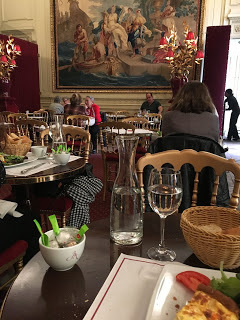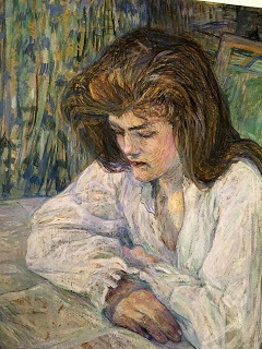 Yesterday, I went on-line to figure out the bus system; I had to get across town and wanted to take a bus, a much better way to travel than the metro if you're not in a hurry, because the banquet of Paris flashes by outside the windows. I figured out which bus I needed - #29 - and where it went, set out, got lost 4 times just finding the street, and then - the street was one way the wrong way. But finally I found my bus. Getting lost is part of the adventure here, in the rabbit warren of little streets going every which way. I am always lost, and Lynn has no sense of direction at all. But we get around.After the long ride right through the right bank, had a long walk to the Musee Jacquemart-André, a museum like the Frick, a gorgeous mansion full of great art. There was a special exhibit of the fabulous collection of a Spanish art collector, including this beautiful Toulouse-Lautrec, the Reader, which I photographed from a book. And then, lunch in the humble little café.