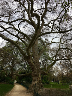 Walked to the Parc Monceau that I'd visited once before, a pretty little park where I sat for an hour on a park bench, watching joggers - French joggers! - listening to birds - birds! - and reading the NYT on my phone. Discovered this magnificent tree, officially one of the "remarkable trees of France," a plane tree planted in 1814.