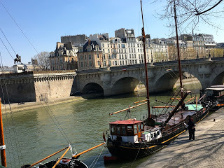 It's Saturday March 25 and your faithful correspondent has had ten hours of sleep and a huge breakfast in the hotel, with chunks of the most delicious bread in the world, a lot of coffee and the French television news - there's a vital election going on here. And hooray, Trump goes down to one more defeat. The sun is shining tentatively, and the world awaits. I'm off soon to meet Lynn, my best friend for fifty years - is that possible? - at the train station, and we'll go to the apartment she has rented for us in the Bastille. Is this real? Am I really here? One minute I'm in my kitchen looking at sparrows, the next, in this ancient city devouring fresh crusty bread and reading "L'Officiel des Spectacles," an 170 page booklet of everything that's on in Paris THIS WEEK.