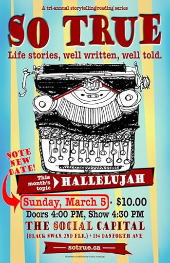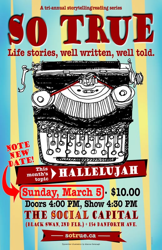 Another issue, however, was quickly resolved. We always hold our So True events at the Social Capital, which is the second floor of the Black Swan on the Danforth, on the final Sunday of February, May and October. But now, it turns out, the bar on the main floor has decided to hire a band for the last Sunday of every month, to play at exactly the same time as our show. The noise upstairs would be deafening.