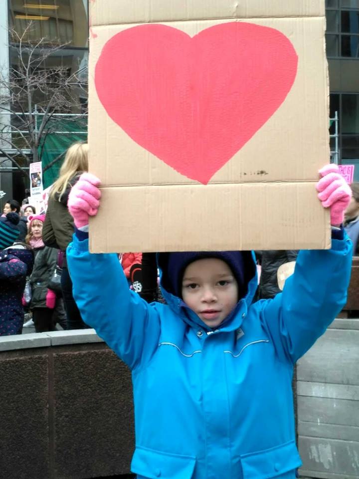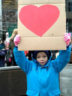 It was two hours after the start by the time we got to City Hall, and at that point the little guys were tired and hungry, so rather than not be able to hear more speeches, we went home to an exhausting evening with two very busy, relentless young men. The level of their energy is overwhelming. We ordered Chinese food for supper and finally they went home, and Sam, Edgar and I could go back to watching, with our jaws hanging open, as Trump's behaviour was debated on TV, and reports came in from around the world about the marches everywhere, everywhere. Humanity has arisen en masse. This is a historic moment. May this spirit of joyful protest last.