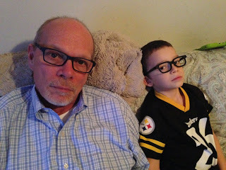 Twins and buddies. Eli's glasses are for play (he's in his Steelers sweatshirt), his grandpa's are not.