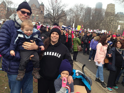 We marched today. We discovered it's not easy to march in a huge crowd with a restless four-year old on a scooter and an 18-month old who totters along like a drunken sailor and does not want to be carried. All around us, thousands and thousands of people, young and old, every colour, every faith - and talk about good will! Such a joyful crowd, peaceful, friendly, open, a heartening number of teenagers and young adults. People gathering to be heard, to be seen. It started on the College streetcar which Edgar and I got to Queen's Park. I didn't expect any crowds on the streetcar, but it was packed with women, and some men, in pink hats, people with signs, everyone talking about Trump and the election. The car had to go by most stops because we couldn't let anyone else on. I talked to a woman not much younger than I who told me it was her first march. "I thought, this is the one to start with." I couldn't imagine never having marched before - perhaps she didn't live in Toronto when Mike Harris was Premier, when there were many vital marches, though none anywhere near this size - but was glad, yes, she is starting now.