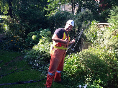 Just an update, for those of you long-term followers of this blog: you remember that I've been battling Bell and Rogers to get the huge tangle of cable wires that cross my backyard taken down. After a year - a full year - of back and forth and men in orange arriving to do this and that and dealing with neighbours who were not happy with one aspect or another - after all that, I was told that today, the guys would be arriving, at last, to take down the wires.