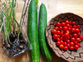 Today's crop - little garlics and tomatoes, but look at those cucumbers! As the giant orange blow-hole would say, YUGE.