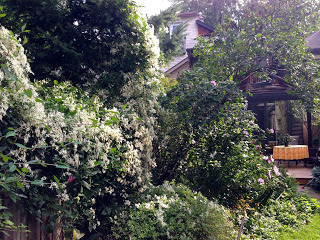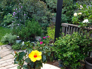 Yesterday, the autumn equinox, was still summer - hot and beautiful. But today it's fall, dank and cool. The authorities say this summer was the hottest on record for Toronto; my tomatoes are proof. Now there's a final flourish - everything is back to blooming, roses, camellias, the bank of late-blooming clematis covering everything, the rose of Sharon never lovelier - just heaven.