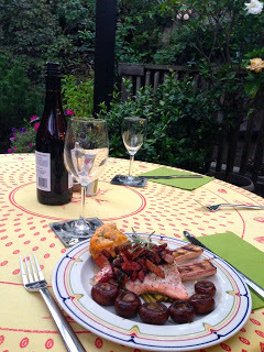 and on Tuesday night, my own fine boy came to cook me dinner - trout and asparagus poached in white wine with a confit of smoked bacon and apricots accompanied by grilled mushrooms, leeks and baked potato - am I lucky or what?