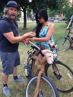 It had the feeling of the Occupy groups - kind of anarchic and peaceful but still getting stuff done. But mostly anarchic. People over 60 were definitely a rare breed, but everyone was welcome; a guy was transported in a rickshaw so he could play his saxophone for us, there was lots of music, we stopped to see people dance and do other interesting things - I love Toronto! And am grateful to Richard, and Jean-Marc who's away today, for including me in some of the amazing things they do.