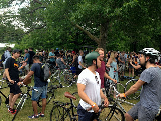 En route - stopping traffic, much honking of horns by enraged drivers as hundreds of bikes took over the streets. Yeah! We stopped at CAMH, the centre for mental health, for a dance program, and went down two levels in the Honest Ed's parking garage for another event. But yes, in the pouring rain, not so much fun. It had the feeling of the Occupy groups - kind of anarchic and peaceful but still getting stuff done. But mostly anarchic. People over 60 were definitely a rare breed, but everyone was welcome; a guy was transported in a rickshaw so he could play his saxophone for us, there was lots of music, we stopped to see people dance and do other interesting things - I love Toronto! And am grateful to Richard, and Jean-Marc who's away today, for including me in some of the amazing things they do.