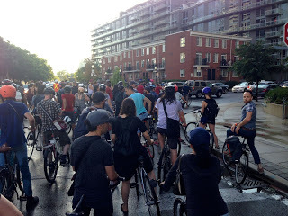 En route - stopping traffic, much honking of horns by enraged drivers as hundreds of bikes took over the streets. Yeah! We stopped at CAMH, the centre for mental health, for a dance program, and went down two levels in the Honest Ed's parking garage for another event. But yes, in the pouring rain, not so much fun.