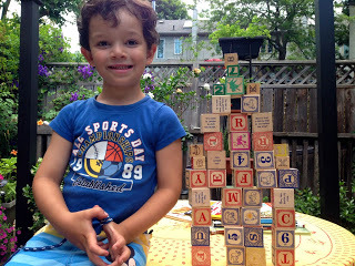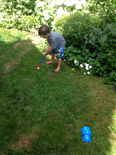The day after my return I had a sleepover with Eli, who was driving his mama crazy. City day camp starts next week, but in the meantime, she has a very stubborn, extremely energetic boy in a small apartment. He and I had a busy visit - did lots of watering here, went to the Farm, then on Saturday morning he washed the car and went for a drive and then played golf, as the men in his family are wont to do on the weekend. Genetics!