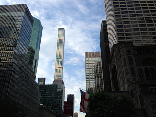 The narrowest skyscraper in the world.I went up 3rd to Eli’s, a gourmet takeout place, which was a mistake – I bought staples and a few treats, cold soup, baked fish, milk and delicious bread – and a jar of organic peanut butter which turned out, when I got to the cash, to cost $12. I spent $63 on a few staples. But at home, the soup – cold carrot and lime – was superb, with a glass of the Pinot I bought at the wine store on the corner, and blueberries from the Puerto Rican fruit stand across the street. And now I’m sitting here waiting for the rain to stop, or at least die down, so I can go to the theatre.
