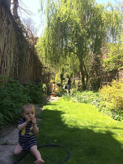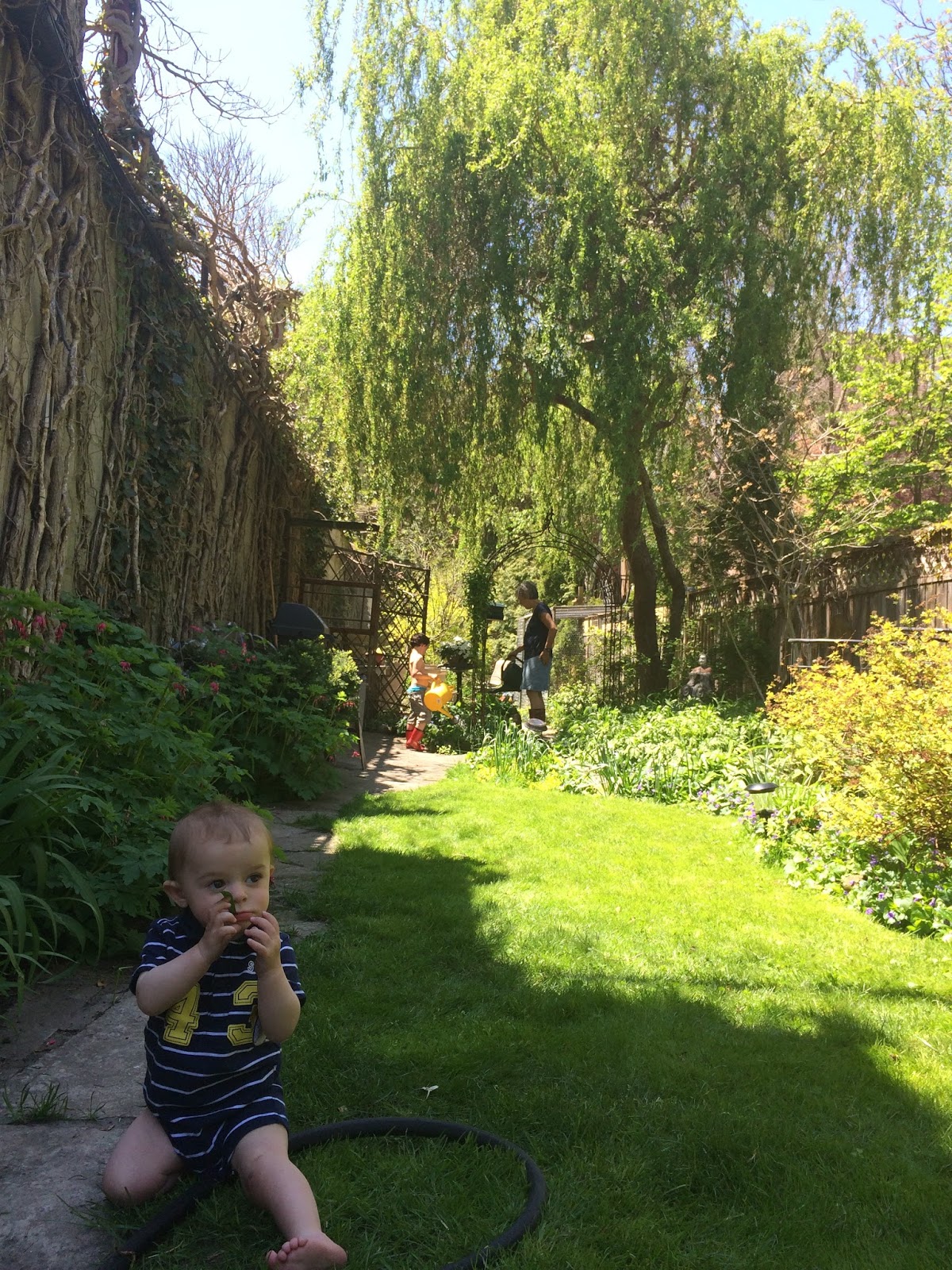 Beautiful - a long weekend, a sweet day of sun and cloud, and the garden exploding with green and bloom. Lucky me - the family came to visit yesterday to celebrate Eli's 4th birthday with his favourite treats - sushi, Duplo and cupcakes. And time in the garden, Eli and I watering, his favourite activity, and Ben crawling on the grass and eating some nice dirt. Here's a shot Anna sent me, Glamma and grandson with their watering cans, Eli's his fave colour - lello. Hard to believe that willow tree above us was five feet high in a flower pot when it was given to me by a neighbour who'd sold her condo to Jian Ghomeshi and was moving away.