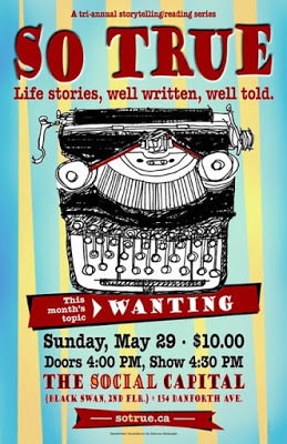 The So True reading event tomorrow - exciting as always. We had a rehearsal last week, a chance for the eight readers, especially those who haven't done this before, to stand up and read their most private stories aloud, get a final edit on the writing and tips on the performance. It gives me such joy to hear their efforts come to fruition - even more so tomorrow, when they'll go public. Thrilling work. And this time, I'm not going to tell a story, I'm going to read one too, an excerpt from the memoir. Nerve-wracking. I'd much rather not put myself on the line, preferring to watch my students go through that torment. But it's important that I do.