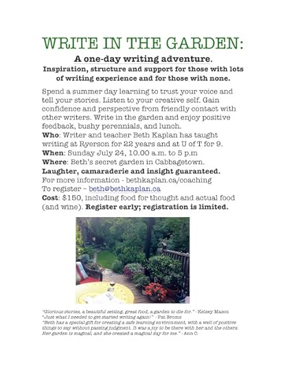 And I - on this holiday, quiet except for the chatter of my neighbours, so incessant that I put in earplugs - I did nothing but work. I went out once for a brief walk, and the rest of the day, I sat on the deck, editing a piece for So True, sending it back and forth 3 or 4 times, and two pieces by students. But more importantly, I wrote a new chapter, rewrote it twelve times, and edited bits of the rest. My bottom is asleep because I have hardly moved from this chair all day. Unhealthy. But wonderful, a writer's idea of heaven - a stock of food and wine, a stunning warm day, a quiet garden (once the earplugs were in) and nothing to do except fiddle with words. And fiddle I did.Right now I love this book, I love moving the words around, I love the stories and the voice. I know, how vain. But it's good to love it sometimes, because other times, I think it's a big stinking pile of hooey.