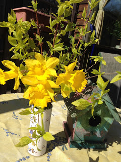 The first bouquet from the garden - and the birdhouse Eli painted for me for Xmas. I just put the Provencal tablecloth on the deck table, on the assumption that it's not going to get snowed on. I know - ha ha, this is Canada and it's only May 2! But there's hope. There is most definitely hope.
