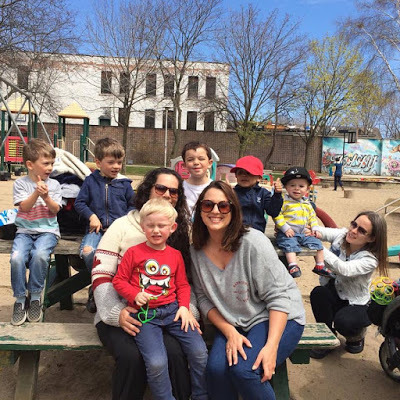 And then he wrote this: My ( Much) Older sister Anna turns one year older today. I don't know a stronger woman or better friend. I love you Anna I don't care what Lana says about you, you're great.And here's Anna's birthday party, at the playground - where else? - with Lana, her best friend, beside her, and a child or two, some of whom might be hers: