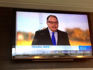 I say humbly that this is one of my favourites of all the photos I've taken. Isn't it an Alec Colville canvas? Also taken through our dining room window: three teenagers, one with this back to the most spectacular view in Canada, on their cellphones. And then, to my delight, who was on the TV set above the bar taking about Obama in London with the Queen but my beloved neighbour Richard Berthelson, royal expert and commentator. It gave me a big hit of home far from home. Soon I'll be able to hug him in the flesh.