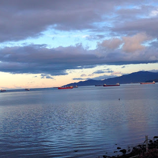 Out there, right now, a slate grey sky, the water a flat blank sheet of the same grey, nine huge tankers waiting in English Bay, one small motorboat chugging past, and in the distance, on the mountains, a hint of white and blue.