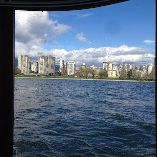 Had lunch with old friend Tara in Kitsilano on Yew St., above. Every street in this city is lined with flowering trees, pinks and whites, it's incredible. And today was supposed to rain. Hah! Tara is writing non-fiction and we had much to discuss as we sat outside in the hot sun, including children, grandchildren, travel, and how to structure a book that has both research and personal story. From the mini-ferry back to the West End. This is looking at Bruce's apartment, somewhere there in the middle behind a tree.