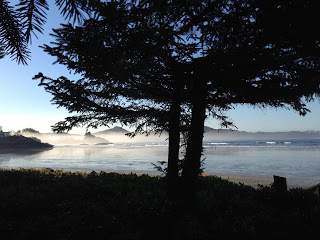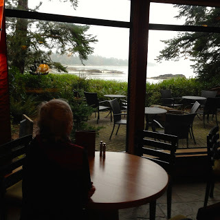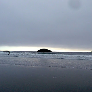 At some point in the Seventies, I camped with a couple of guys on Chesterman Beach. I remember it only vaguely - was one of them my boyfriend? I have no idea, but it was a hippy adventure. No one camps there now, but tonight, as Patsy and I walked there at dusk, at one end was a crowd of about 30 surfers, black spots flailing about in the waves.She and I walked on to famous, luxurious Wickaninnish Inn to have a glass of wine in the beachside cafe. In April 1981 - exactly 35 years ago - I was 8 months pregnant, and Edgar and I came from Vancouver to a little cabin near Long Beach for a last holiday, a few days alone before our lives changed forever. We had a cup of tea in the Inn and I stole an ashtray, which I still have. This time - a drink, a view, pleasure. And that baby has produced two babies, and my second baby is on vacation in Barbados. All's well that ends well.
