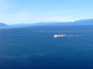 PPPS Tara just texted that there's a whale in the inlet near their house just across English Bay from me. "Maybe it'll come your way," she said. I'm looking through Bruce's binoculars. Not often that I spend a quiet Monday night watching for a whale.