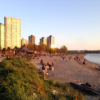 Spent yesterday afternoon working in the sunshine - am rereading the manuscript one last time before sending it out to a few readers, as I don't know any more what it needs. Chris came for dinner and afterwards we went for a walk, at dusk after a sunny day - the beach jammed with people, Denman Street packed, nearly impassable - what a rich outdoor life there is here, Toronto can only dream. We bought a gelato and sat on a bench by the ocean watching the crowds as the sun set behind the mountains. Sublime, this city can be sublime. Also, however, ugly and harsh in the number of street people, homeless, addicts, the problem much more extreme than we face in the cold east. The other side of Paradise.
