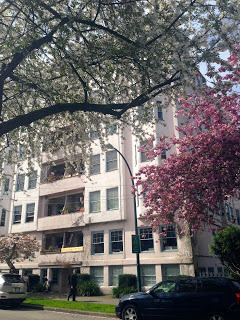I walked around Lost Lagoon in Stanley Park this morning. Swans are nesting. Then I went to the liquor store to buy some Prosecco for Chris. Had lunch with old friend Tara in Kitsilano on Yew St., above. Every street in this city is lined with flowering trees, pinks and whites, it's incredible. And today was supposed to rain. Hah! Tara is writing non-fiction and we had much to discuss as we sat outside in the hot sun, including children, grandchildren, travel, and how to structure a book that has both research and personal story.