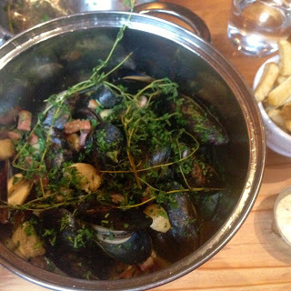 Shelter, a wonderful restaurant in Tofino - it's teeming rain, and I'm presented with Cortez Island mussels in white wine, chunks of garlic and fresh thyme - and frites