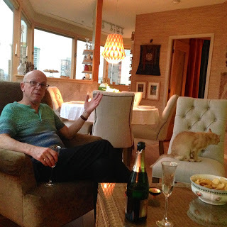 Yesterday, Chris and I met at 4 for champagne in his bright, tiny, exquisitely tasteful apartment, where he has refinished every detail, including walls of Carrera marble, a designer fishtank and a blonde cat who matches the pine floor.