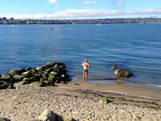 And we saw a man swimming. I was wearing my usual 12 layers, the air was chilly despite the sun and the water was freezing, but he was swimming.A gourmet lunch at Chris's - leftovers from our gourmet dinner, he is such a good cook! - and then home to rest before going out to feast again, this time with old friends Margaret and Roy. As a special treat, Allison and Monty and their daughter Claire were there too. Allison was the designer for the Arts Club Theatre while I worked there - she's designing there still - so we go back 40 years as colleagues and friends. Allison's other daughter has two young sons. Since we last met, impossible as it is to believe, we've both turned into grandmothers. I know. Surreal.