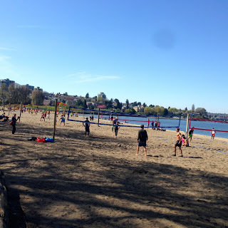 Kits Beach on April 2 Beach volleyball. The first week of April! I do have to say that apparently even the Vancouverites are marvelling at the heat; some of the trees are weeks ahead in blooming....