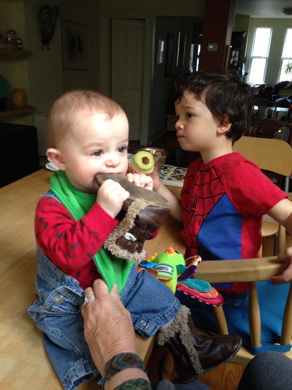 Snack time - for Eli an apple, for poor starving Ben, his own boot. Delicious.
