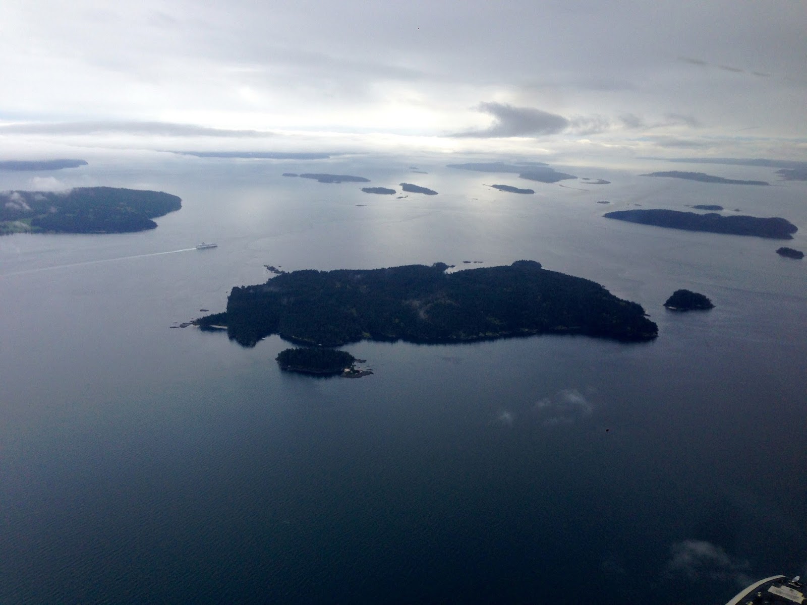 The floatplane from Vancouver to Victoria entered a fog patch and all the windows, including the pilot's at the front, were sheer white, visibility zero. Eventually the clouds parted ... ...and there were islands in the mist.