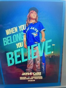 Most importantly, my younger grandson Ben. Last summer the boys were part of a free Blue Jays sports camp for inner city kids, and at the end, a few kids were chosen to attend a game and be part of an ad campaign for Jays Care. Ben of the long blonde hair was one of them. The ad campaign just came out; it’s possible he’ll be splashed on billboards and in the media. And this is a boy who detests having his picture taken. As you can plainly see. LOL. Way to go, Ben!